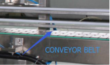 Nggunakake sabuk conveyor kanggo botol Feed lan sistem kontrol Frekuensi kasebut.